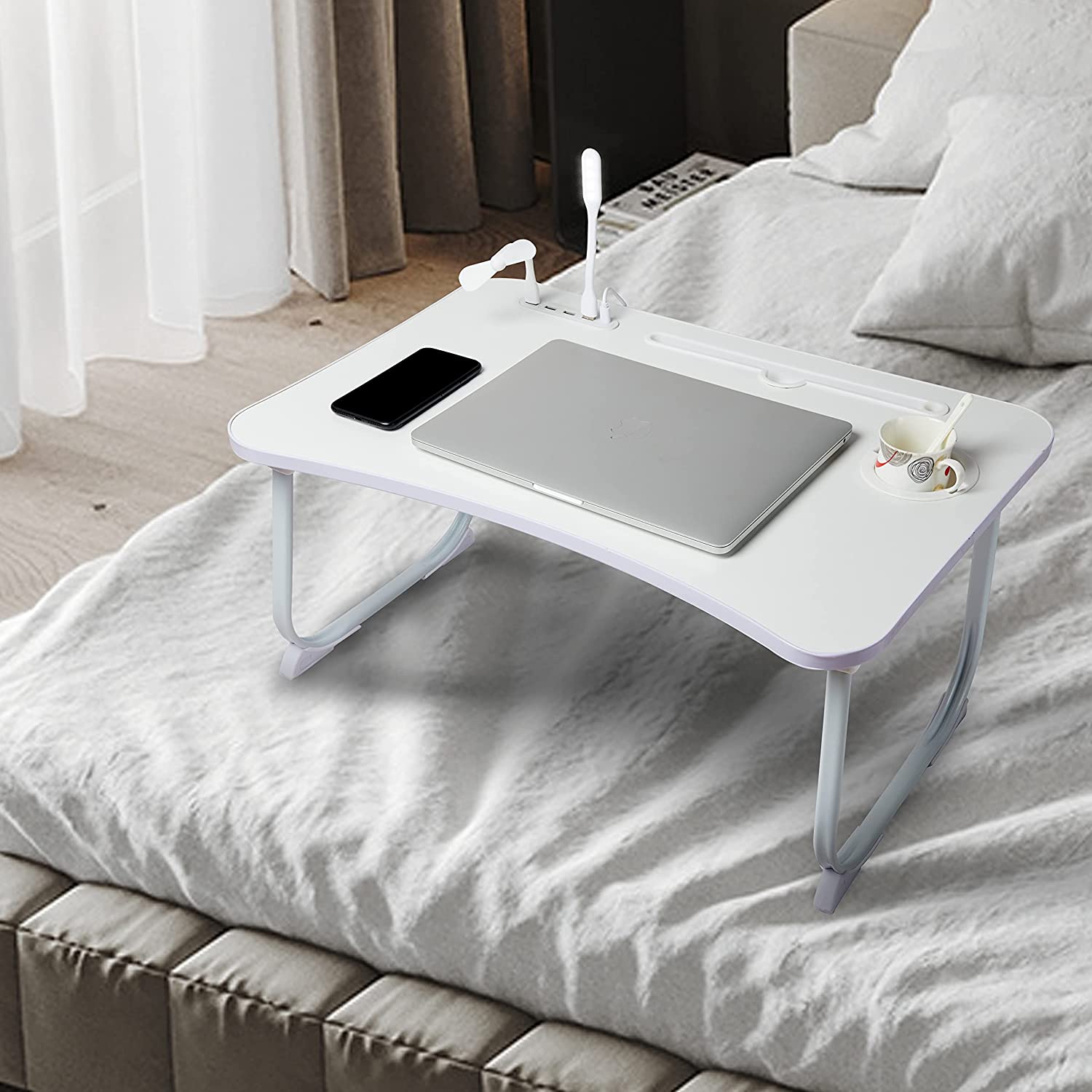 GoRogue Laptop Table for Bed & Sofa, Foldable Desk with Cup Holder, Drawer & Built-in USB Hub with Free Mini Fan, LED Lamp (White)